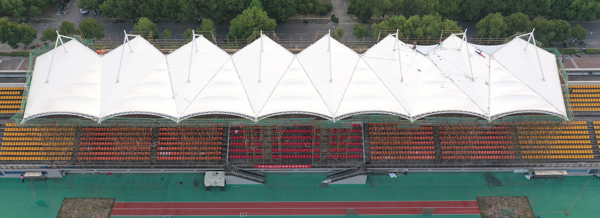 位于安徽六安技術(shù)學(xué)院的帽頂式膜結(jié)構(gòu)看臺(tái),面積1200平方米,采用PVDF膜材。膜結(jié)構(gòu)看臺(tái)造型美觀大方,空間跨度大,自重輕,施工周期短,使用年限時(shí)間長(zhǎng)等。而高透光及折射性質(zhì),營(yíng)造了自然明亮的感覺。