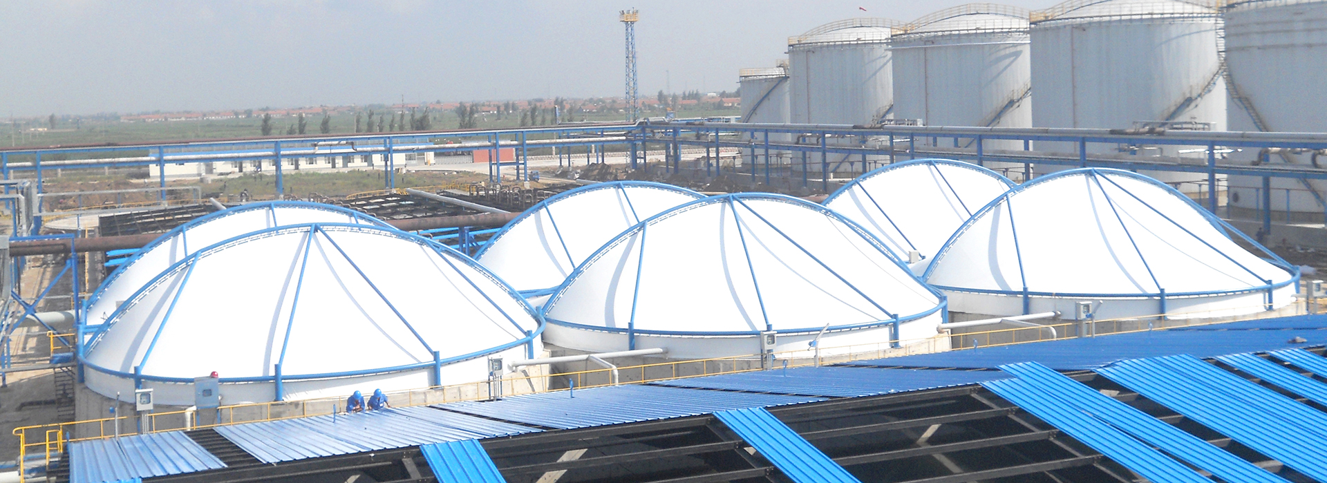 大型池體(如污泥氧化溝、濃縮池、消化池)的氣體收集及污水池處理等是生態(tài)環(huán)保的一項(xiàng)大工程。膜結(jié)構(gòu)材料特有的大跨度、韌性好、耐腐蝕、使用年限久等性能恰恰滿足,為關(guān)愛人民,構(gòu)建和諧社會(huì),創(chuàng)建優(yōu)美的生活環(huán)境貢獻(xiàn)力量。
