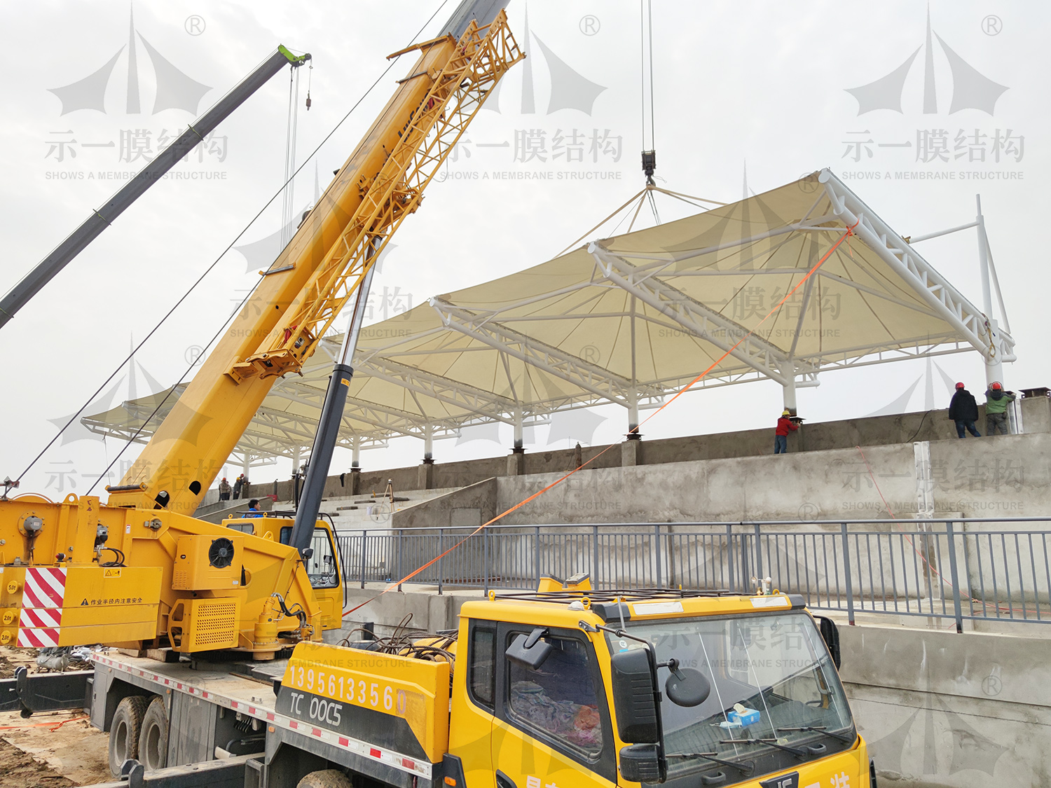 按網架剛度定出分條網架單元在拼裝支架上,按設計位置拼裝好,降落拼裝支點,將拼裝支架往前滑移一個分條網架單元,再與已拼裝好的網架拼接連接成整體的方法。