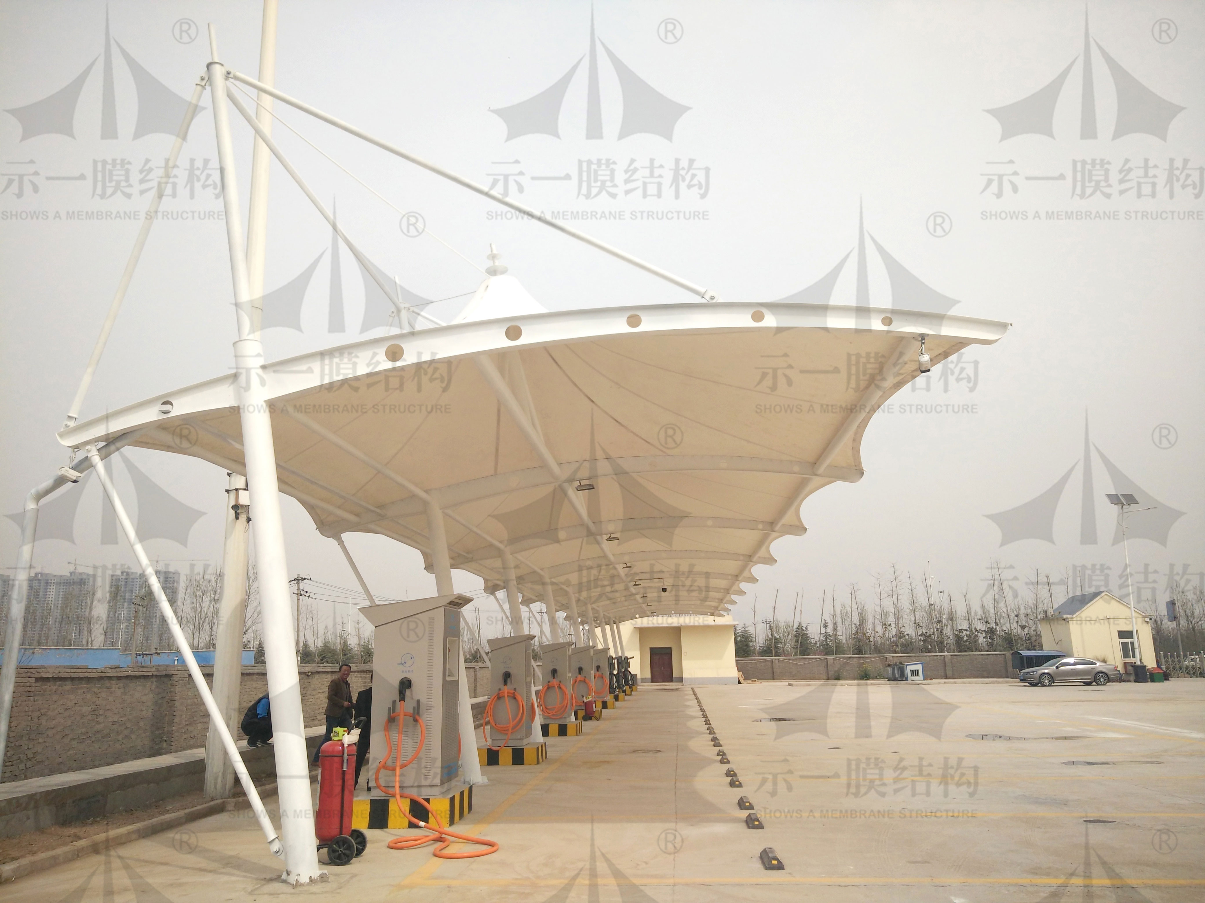 膜結構車棚的特點一定要來說一說的。第一、透光性佳——隨著膜結構常用膜材強度越來越高,使用高強度的膜材可以有效的抵擋大量的紫外線,有效的保護車輛,它的透光效果達20%,在膜結構頂棚的遮蔽下,充電樁仍然亮度十足,透過膜結構的陽光變得柔和,大大減少了車輛的因陽光長時間照射產生的老化。