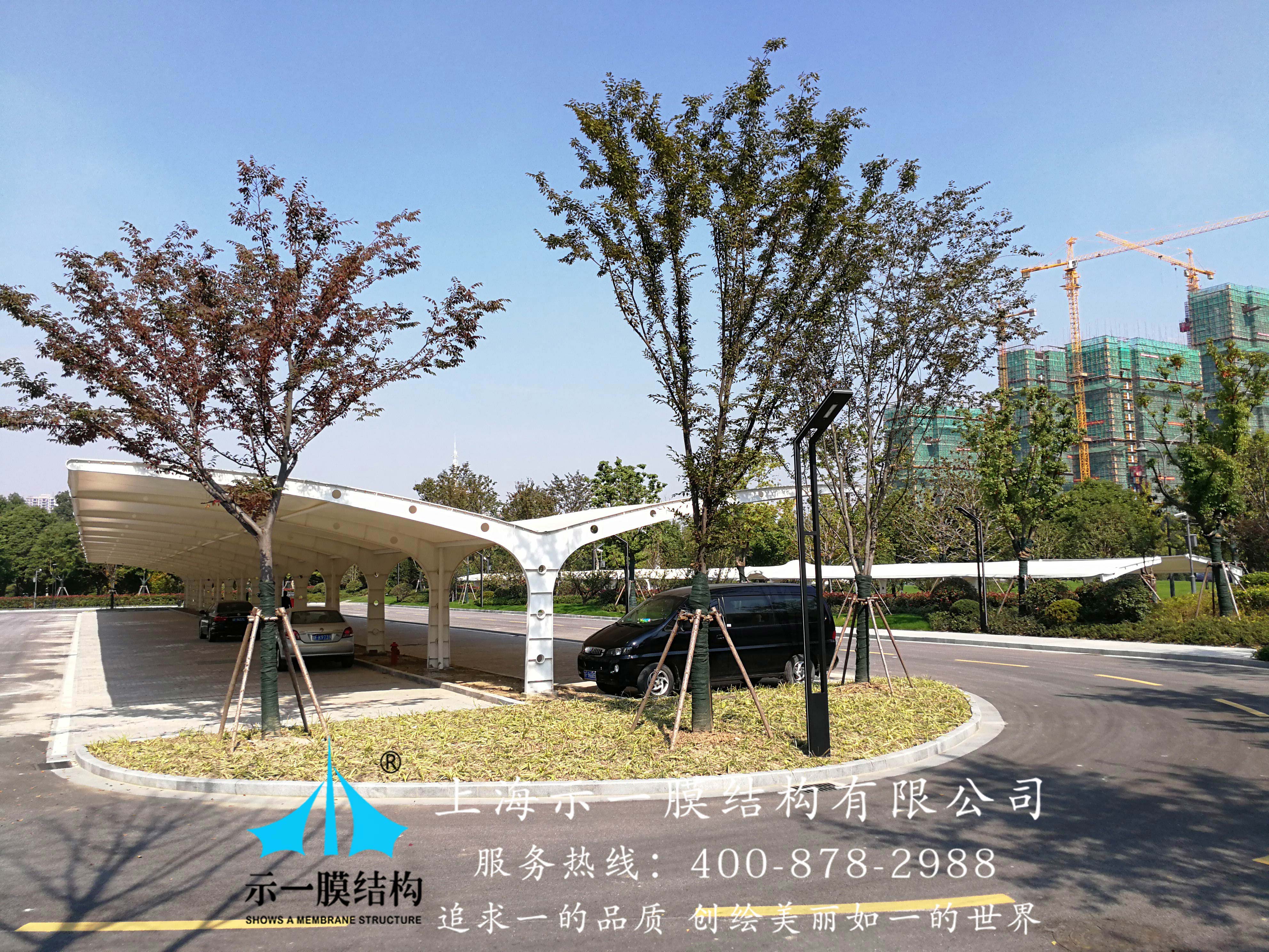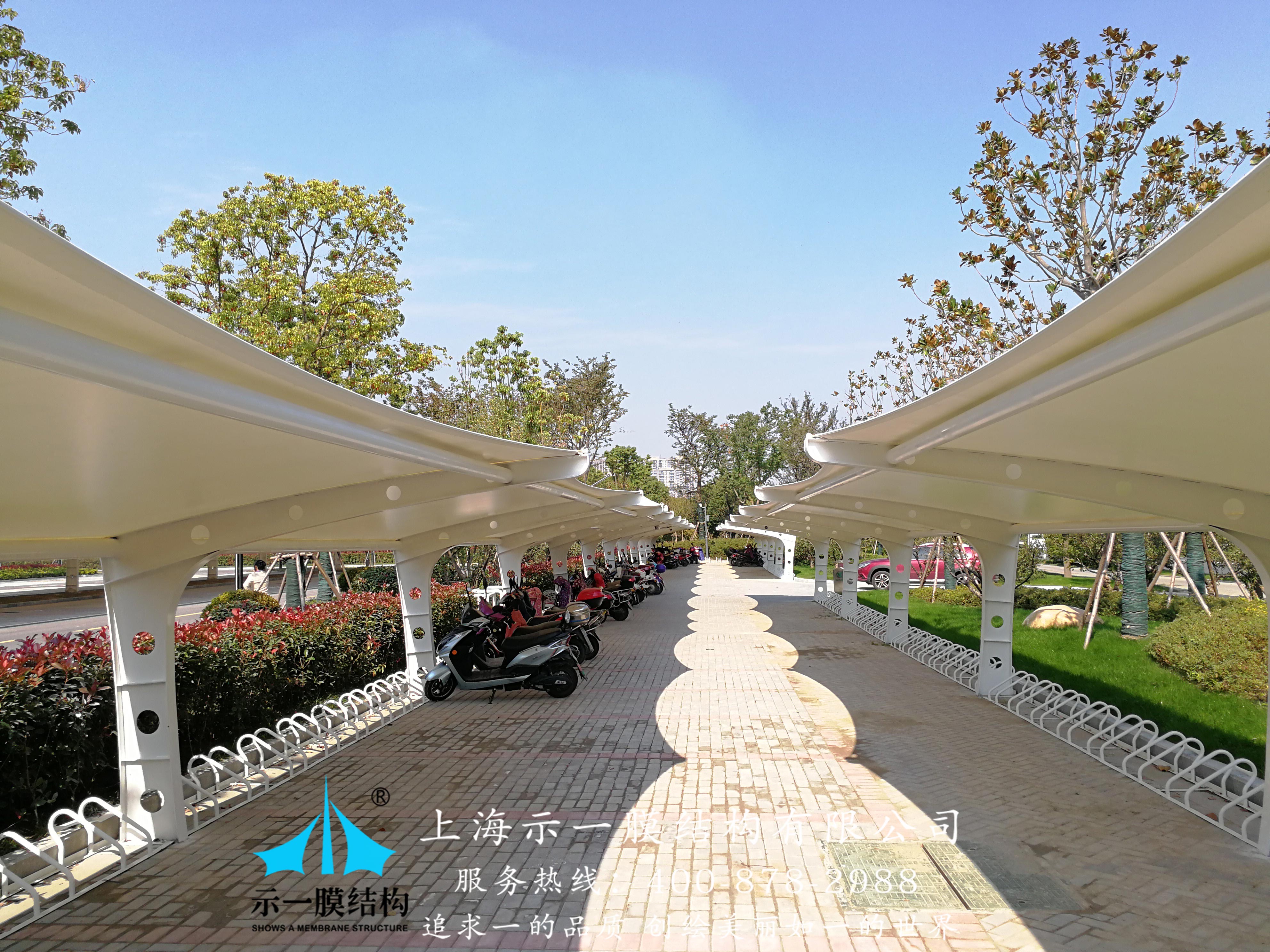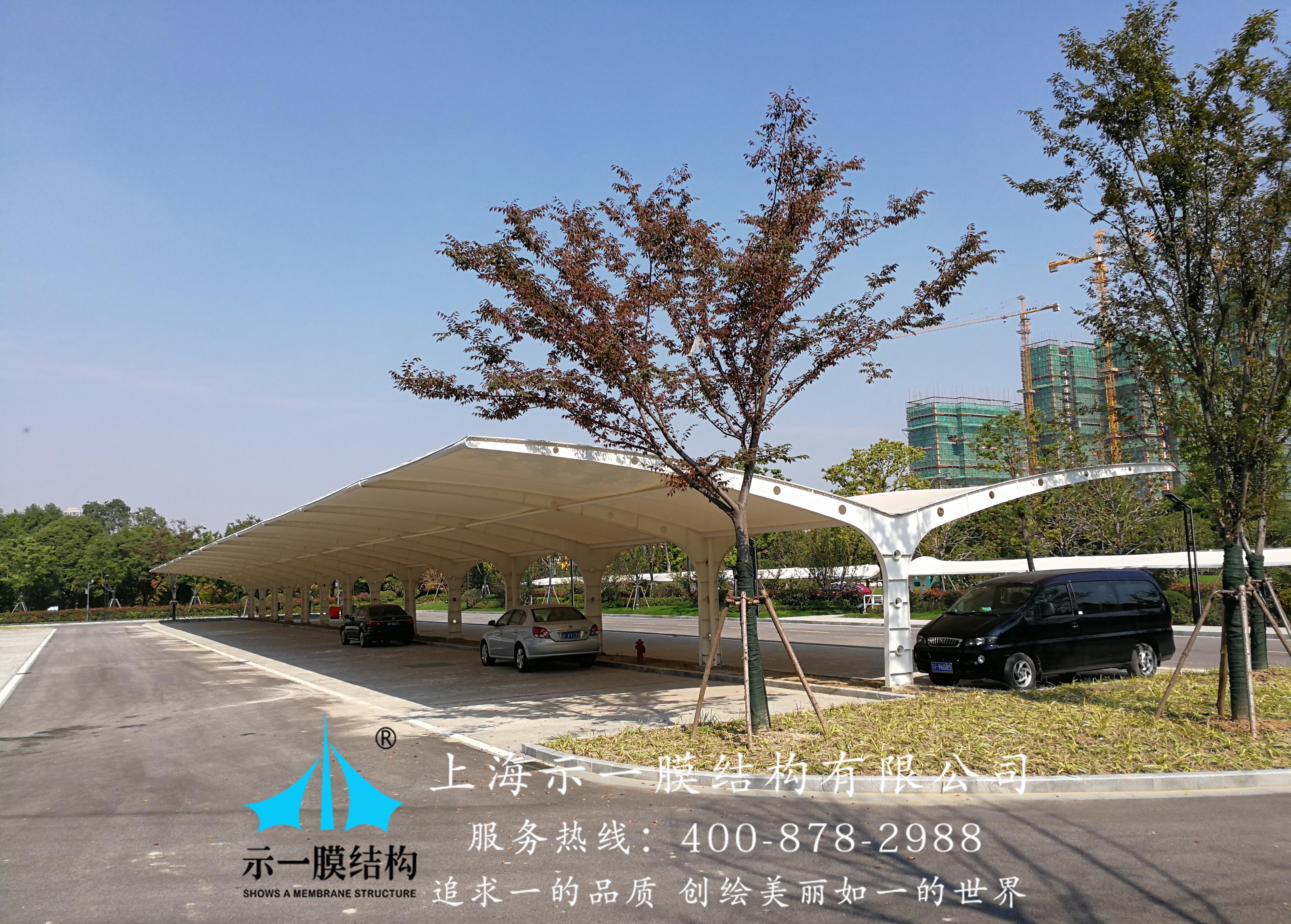 南通市政府招標工程項目,膜結構雙挑車棚由上海示一膜結構有限公司承建,總體面積1019平方米,材質選用的是國產PVDF建筑膜材。從起初的設計方案,到鋼架結構及膜布加工均由示一膜結構公司車間完成。示一膜結構公司指派公司現場安裝團隊監督管理安裝。工程整體質保2年,膜材質保10年,定期維護也標準流程執行;