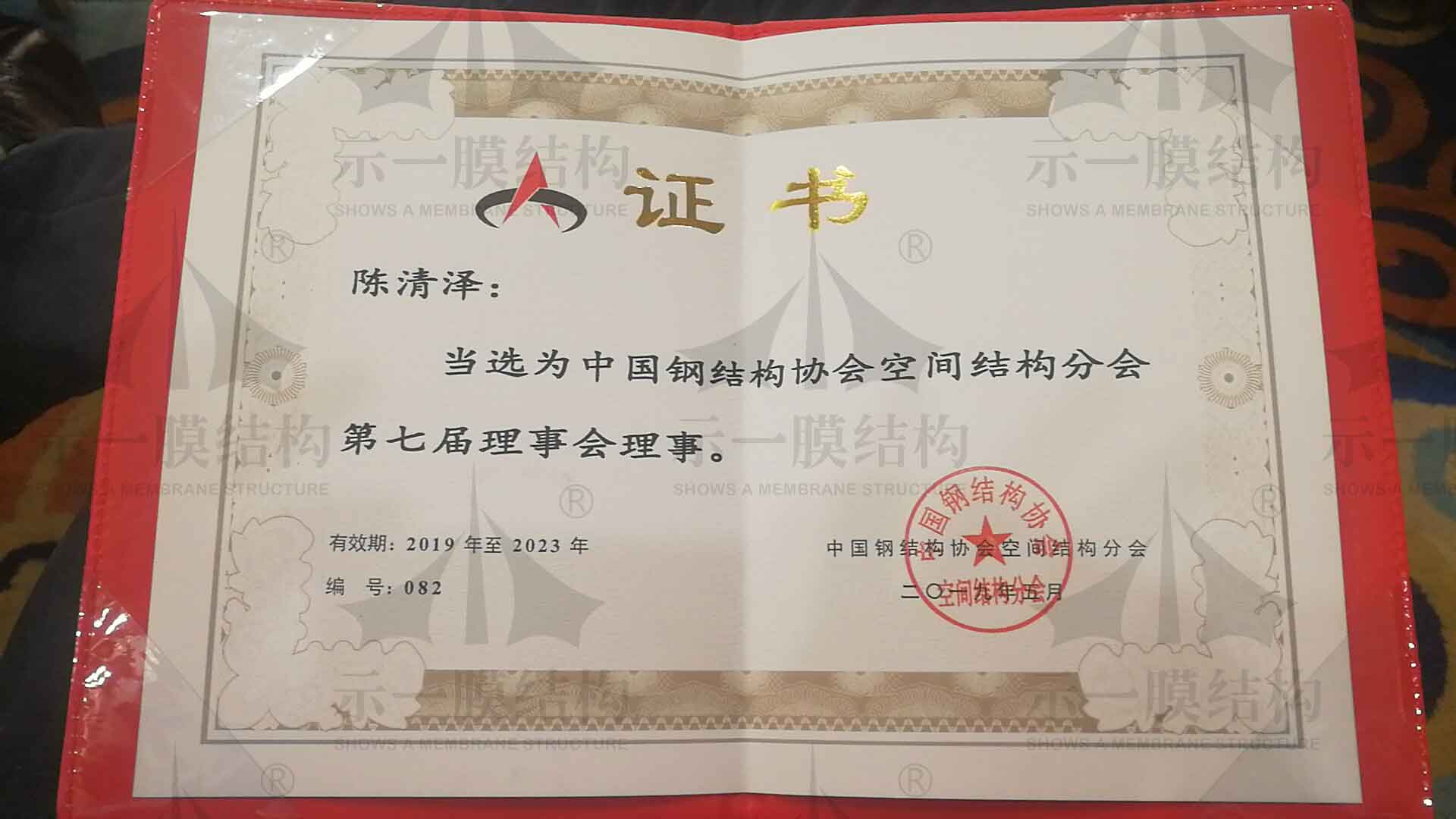 還有一件值得高興的事小編想和大家一起分享。那就是我們上海示一膜結構有限公司陳清澤先生被當選為中國鋼結構協會空間結構分會第七屆理事會理事并頒發了榮譽證書。