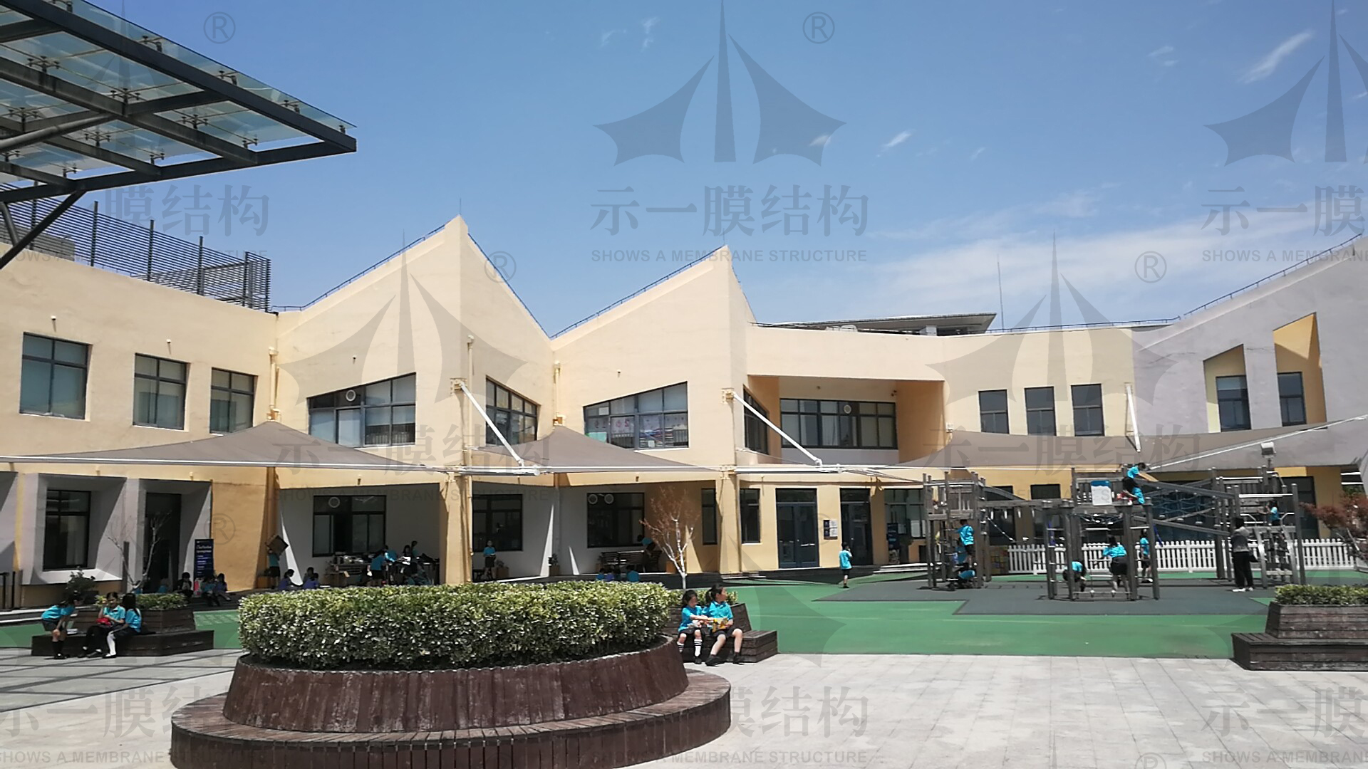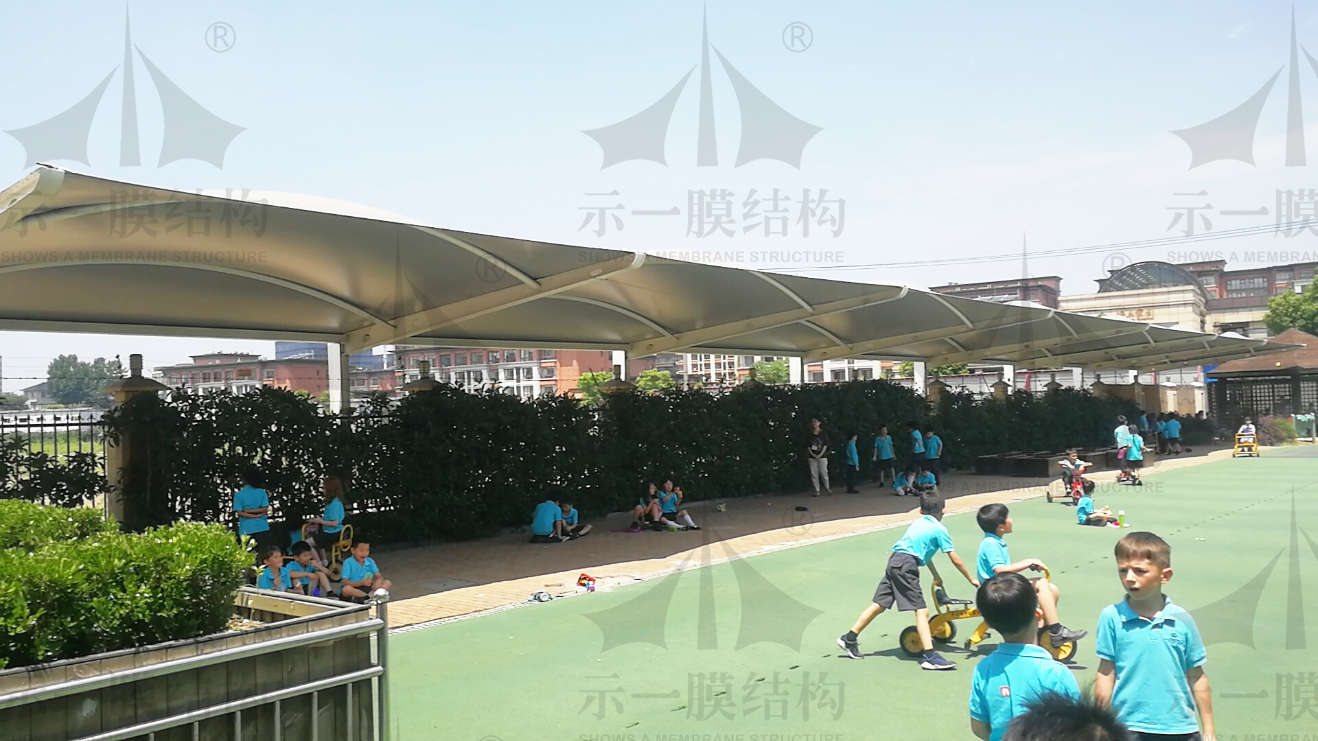 我們再來看看膜結構遮陽棚,天氣炎熱的時候,紫外線特別的強烈。膜結構遮陽棚很好的阻擋了紫外線,保護我們的避免曬傷。 簡單美麗的造型和學校非常搭配,同學們可以在遮陽棚下面休息,聊天,做任何自己喜歡做的事。童年的記憶是美好的也是難忘的。