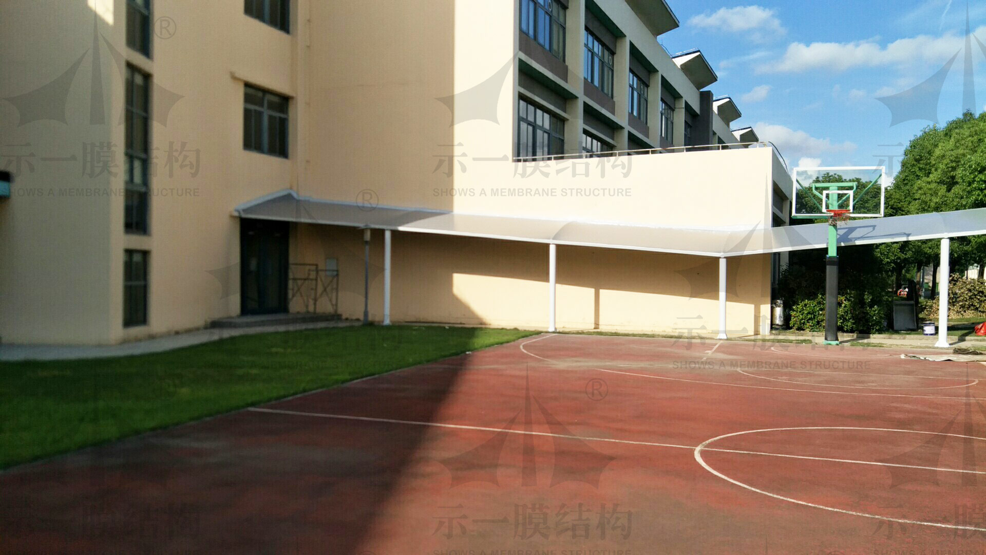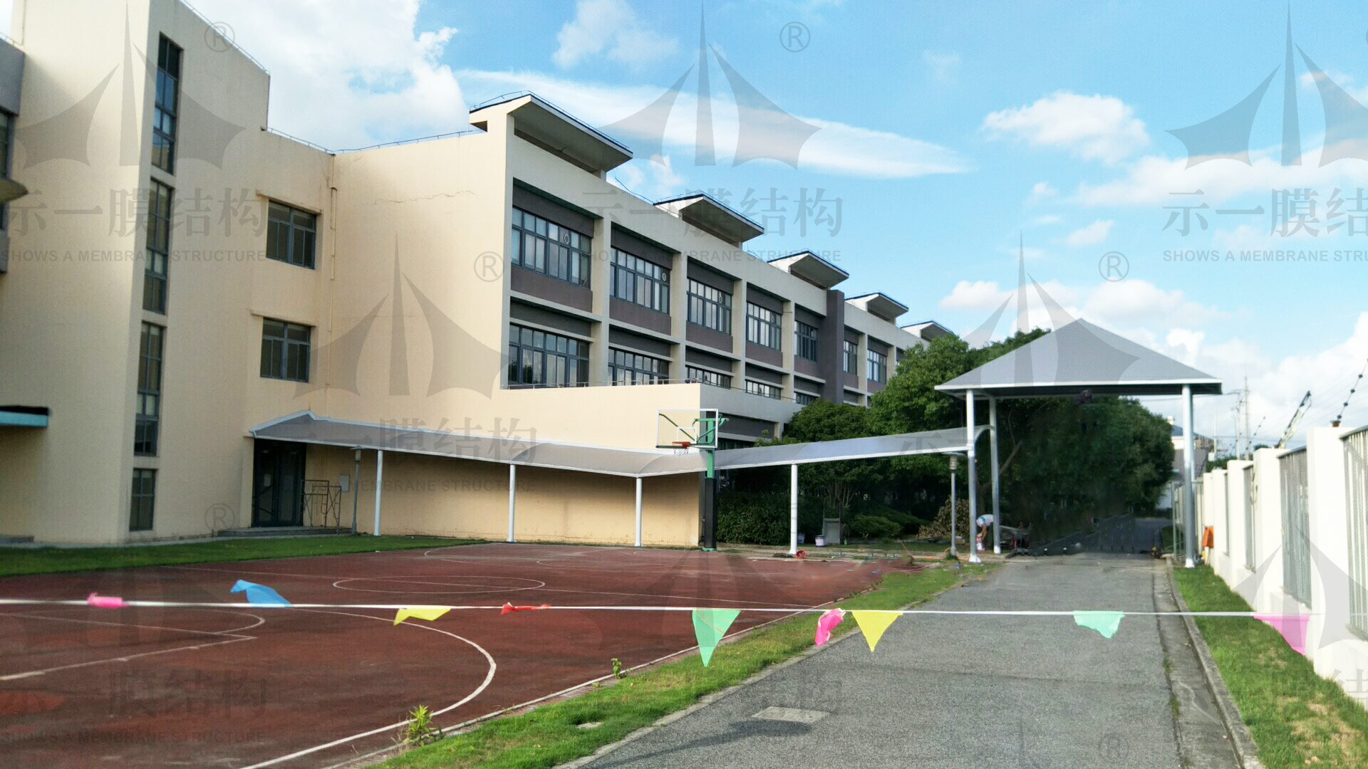 這是一個坐落于上海英國學校里面的遮陽棚,炸眼一看是一個膜結構連廊加冒頂遮陽棚的組合形式,造型和以往的膜結構建筑還真的不一樣,很新穎很特別。遠看就是一個完整的個體形式。從實用性上來說是很好的,整個膜結構從學校大樓門口一直連接下去形成一個長長的走廊,長廊的盡頭和一個膜結構遮陽棚相連接,完美的組合。小編在這里不多說了,給大家上圖看看吧!