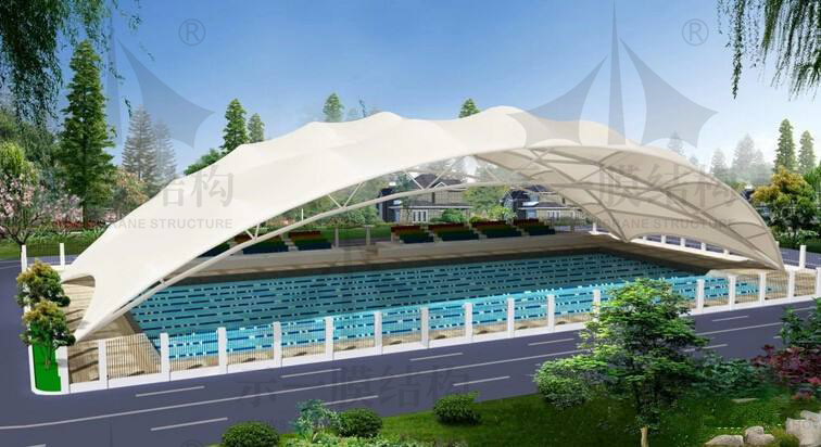第三點(diǎn):工場加工施工速度快,在設(shè)計完成之后,膜結(jié)構(gòu)遮陽棚所需要的鋼構(gòu)件以及膜材都是在工場進(jìn)行加工、剪裁,然后運(yùn)送到現(xiàn)場進(jìn)行安裝的,由于膜材一般采用吊裝,張拉成型,這就大大減少了游泳池場地的占用時間,降低由于施工所帶來的營業(yè)損失。