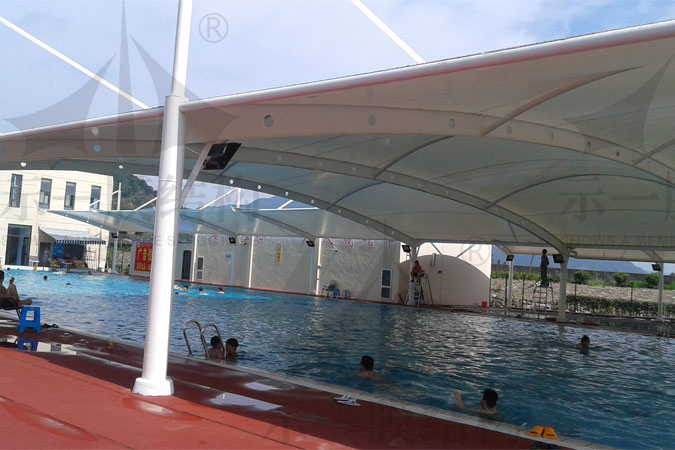 接著我們來看看游泳池遮陽膜結構,膜結構遮陽棚與戶外游泳池的強強聯手不僅給我們一種新鮮感,關鍵的一點是有防紫外線和隔溫效果。