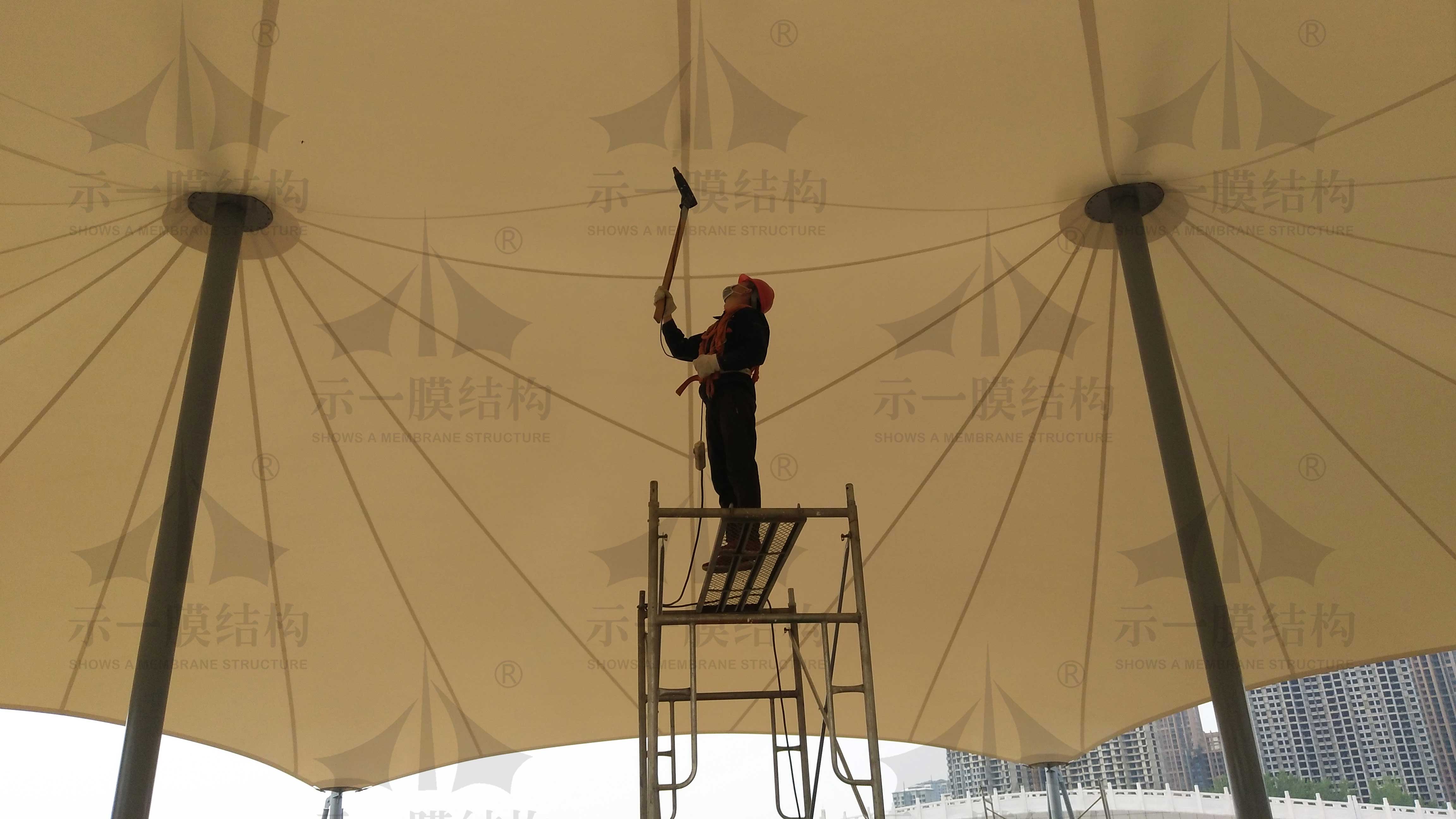 上海示一膜結構有限公司是一家專業從事膜結構工程的設計開發、加工制造、施工安裝、維護咨詢于一體的實體化服務型企業。公司擁有先進的膜加工設備及檢驗,測試設備,并擁有國際先進的膜結構設計軟件,是國內頗具規模的專業性膜結構公司之一。