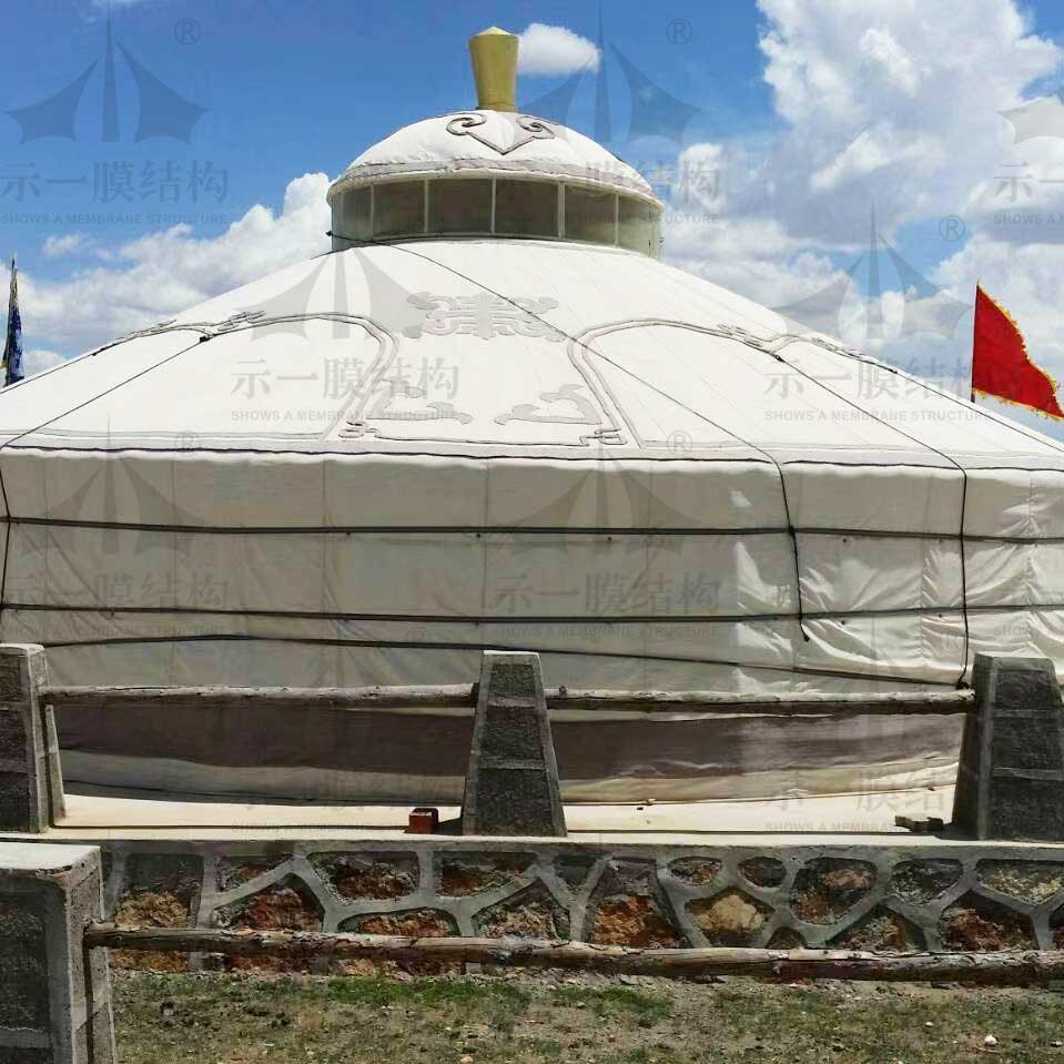 2、膜結構蒙古包具有防火性,因為膜材是由難燃的聚酯纖維組成,如果只是局部明火的話,一旦膜面不能直接接觸,那么膜材料上的火會自行熄滅,因為組織物圖層中都附加著防著火飛濺的添加濟,這樣就給能住人的蒙古包增加了一層安全保障。