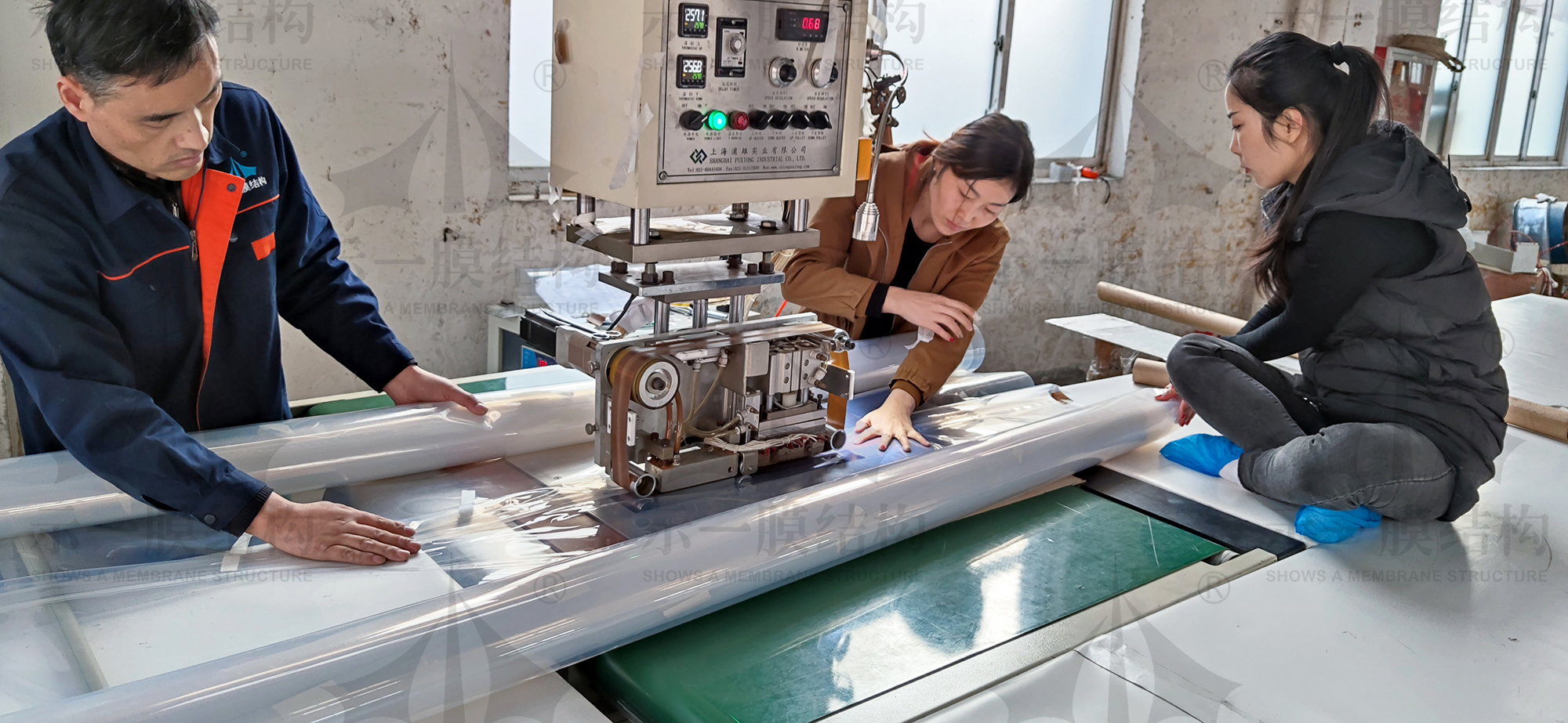 看,膜布車間最近忙著在加工一批ETFE膜材,ETFE膜是透明建筑結構中品質優越的替代材料,多年來在許多工程中以其眾多優點被證明為可信賴且經濟實用的屋頂材料。同時ETFE膜材具有良好的工程技術特性,撕拉極強、抗張強度高、中等硬度、抗沖擊能力、伸縮壽命長、裝飾性好,色彩鮮艷、光澤動人、自潔性好等一系列特點使其成為一種新型的建筑材料。