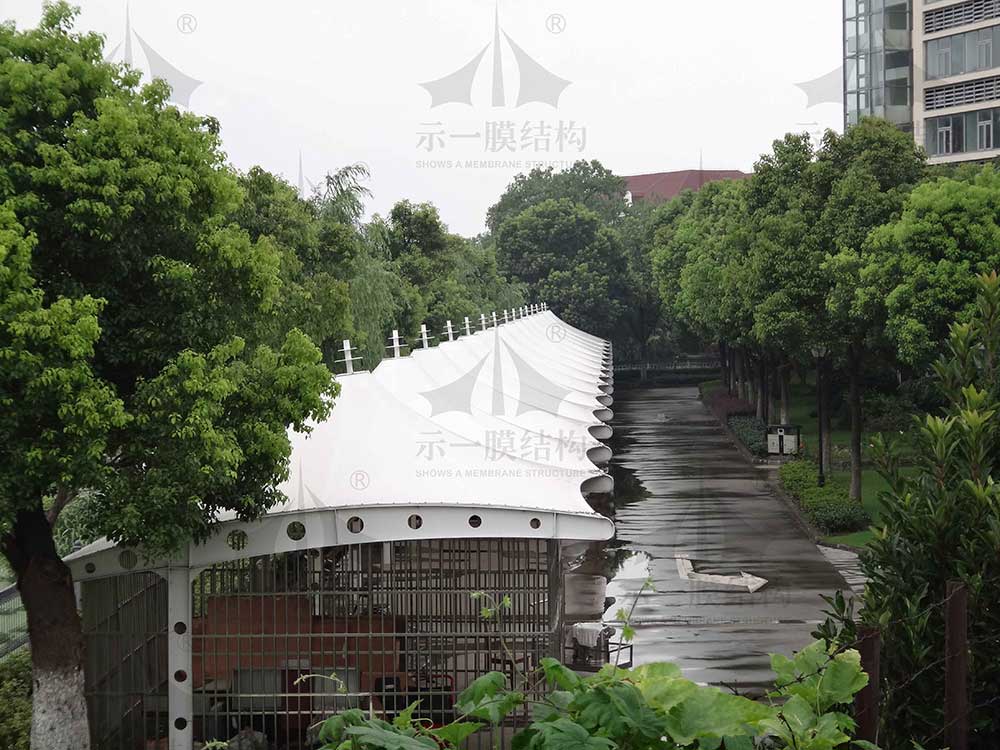 七字型膜結構車棚由于樣式美觀,造價低,深受廣大客戶的喜愛。它的優點是結構靈活,占地面積小,在狹窄的空間也能建造。