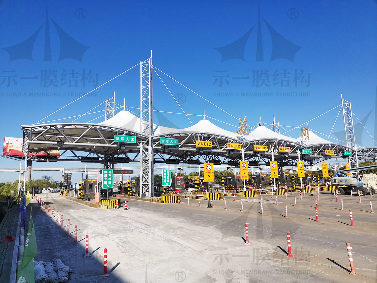 收費(fèi)站膜結(jié)構(gòu)在城市的一角占有某種程度上的重要位置,那么在收費(fèi)站的打造上也是在不斷進(jìn)步和改善。除了要保持持久耐用,而且在造型上簡單而大氣。我們選用膜結(jié)構(gòu)的形式,設(shè)計(jì)出新穎的造型。膜結(jié)構(gòu)因其造型藝術(shù)柔美、結(jié)構(gòu)輕巧、阻燃抗震、安裝快捷、節(jié)能環(huán)保、自潔性強(qiáng)等特點(diǎn),逐漸成為了收費(fèi)站建設(shè)的首選結(jié)構(gòu)。