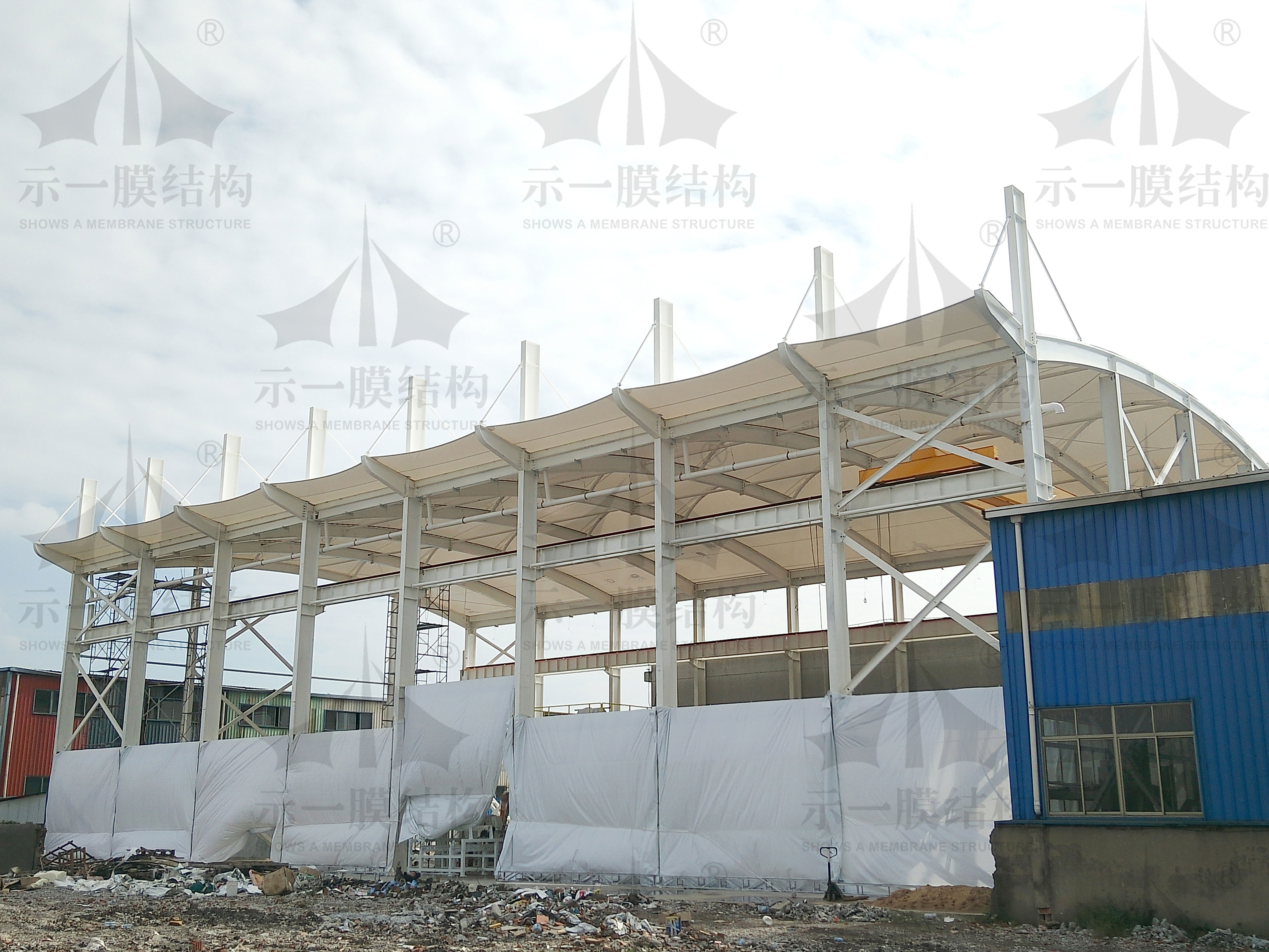 膜材裁剪拼合成型及骨架的鋼結(jié)構(gòu)、鋼索均在工廠加工制作,現(xiàn)場只需組裝,施工簡便,故施工周期比傳統(tǒng)建筑短。