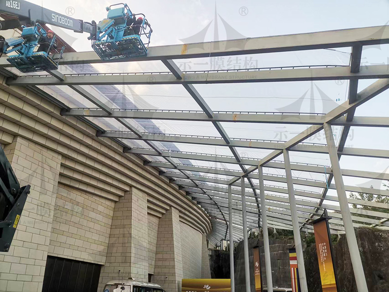 一般情況下,膜結(jié)構(gòu)子分部工程可按制作分項(xiàng)工程與安裝分項(xiàng)工程進(jìn)行驗(yàn)收,但在實(shí)際工程中也可僅劃分為膜結(jié)構(gòu)安裝分項(xiàng)工程,膜單元成品可按材料/構(gòu)配件進(jìn)場報(bào)驗(yàn)的方式直接報(bào)驗(yàn),需提供數(shù)量清單、質(zhì)量證明、過程控制、自檢結(jié)果等文件。膜結(jié)構(gòu)工程中施加預(yù)張力是一關(guān)鍵環(huán)節(jié),其施加過程和數(shù)值記錄應(yīng)該包含在施工現(xiàn)場質(zhì)量管理檢查記錄中。膜結(jié)構(gòu)、鋼構(gòu)件、索等在制作、安裝過程中均可能出現(xiàn)尺寸誤差,膜面還可能局部出現(xiàn)褶皺,如經(jīng)設(shè)計(jì)、制作、安裝方協(xié)商,認(rèn)為不影響安全使用,即可不做處理。對于膜面張力值的檢查,目前國內(nèi)外尚無能夠準(zhǔn)確測量膜面張力的儀器,此項(xiàng)規(guī)定不要求強(qiáng)制執(zhí)行,但要求進(jìn)行過程控制,并做經(jīng)驗(yàn)判斷。