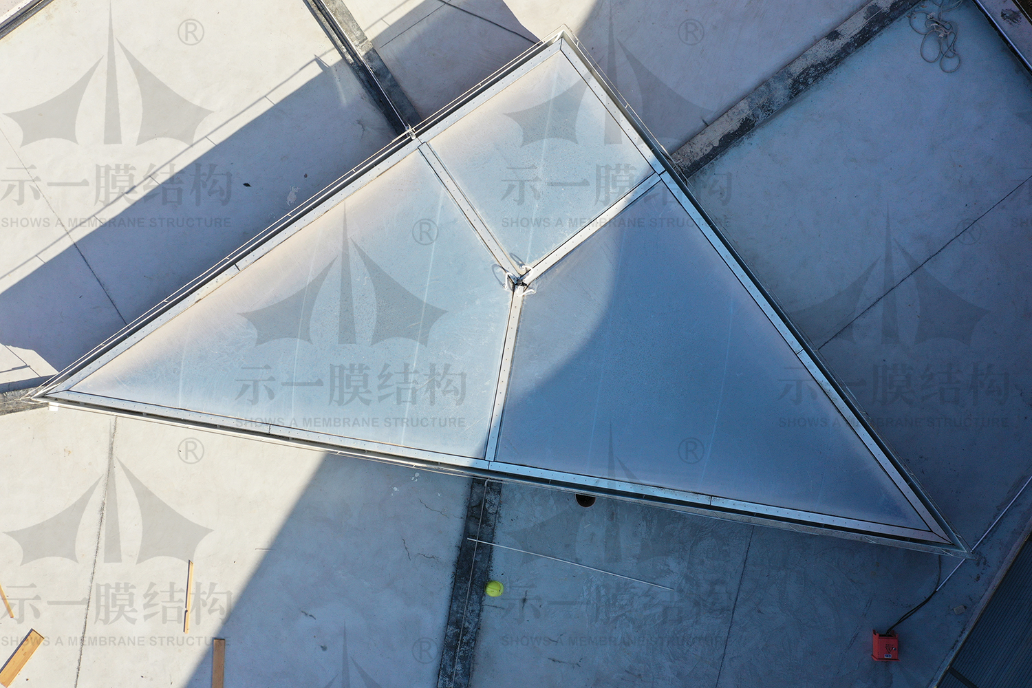 膜結(jié)構(gòu)的安裝次序,總體是先安裝面積大的區(qū)域,再根據(jù)現(xiàn)場(chǎng)及鋼結(jié)構(gòu)作業(yè)面的交付情 況安裝相應(yīng)相鄰區(qū);采用從中間往兩邊,從高到低的順序來安裝,按區(qū)域進(jìn)行安裝、同時(shí)至少保證 3 組人員開工,主要采用吊車的方式,把 ETFE 膜材料加工完成的成品箱吊裝至網(wǎng)架結(jié)構(gòu)上表面、通過二次轉(zhuǎn)運(yùn),按中間向兩邊的順序一組的安裝,安裝的同時(shí)布置管線,每個(gè) 分片區(qū)域全部安裝完成后,進(jìn)行調(diào)試充氣,循環(huán)進(jìn)行,直到膜結(jié)構(gòu)工程完成。