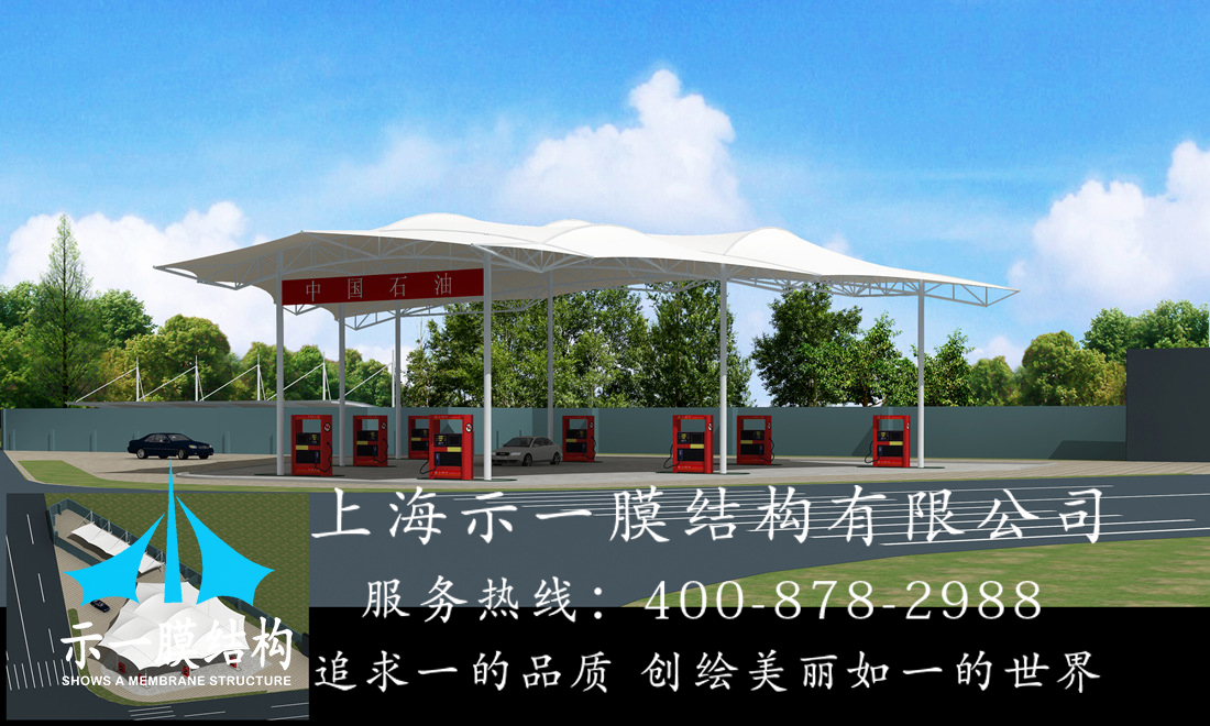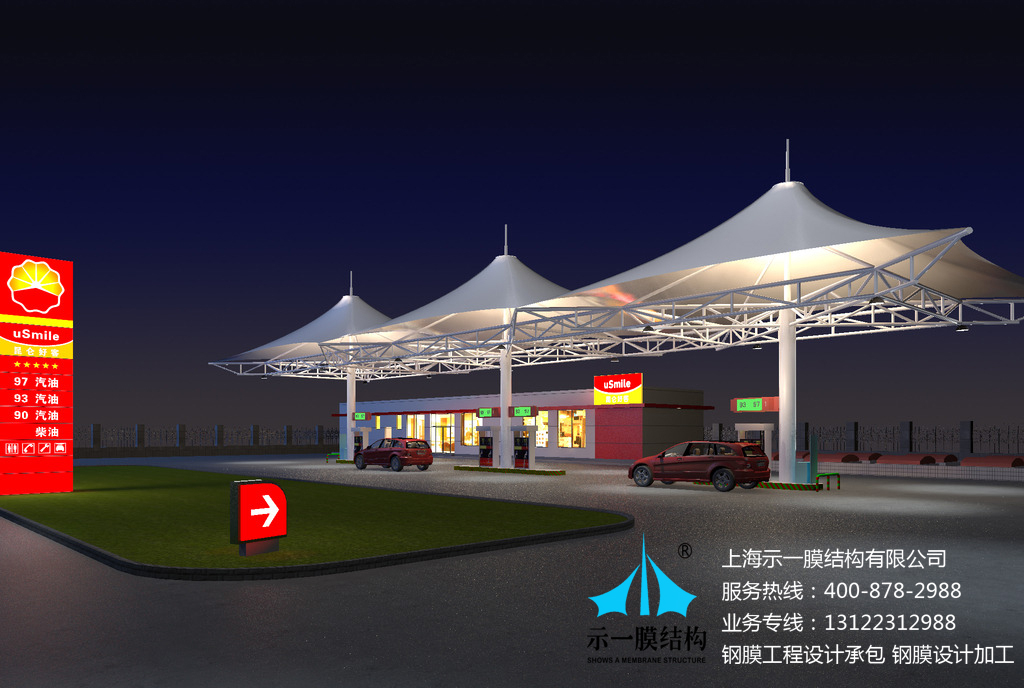 加油站廣場空間跨度大,屬于開放空間,運用鋼膜材料來設計建造十分可取。通過膜材料結合鋼柱支撐的膜結構能使加油站整體環境起到美化作用。膜結構材料具備功能上的諸多優點,是非常值得推廣使用的建筑結構形式,相信不久的將來,加油站膜結構頂棚會越來越常見。