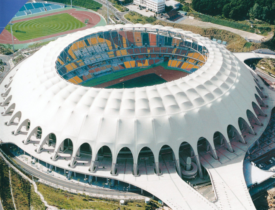 之后,用特氟隆材料做成的室內(nèi)充氣式膜結(jié)構(gòu)相繼出現(xiàn)在大中型體育館中,如1975年建成的密歇根州龐蒂亞克“銀色穹頂”(橢圓形220×159m),1988年建成的日本東京體育館(室內(nèi)凈面積4,6767㎡)。