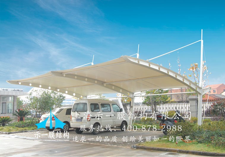 膜結構車棚遮陽棚適用于小汽車、自行車或電動車、公交車停車場等,款式新穎,造型美觀,經濟適用。膜結構車棚的設計技術越來越先進,膜結構材料具有連接可靠、施工方便等特點,最關鍵的是膜材具有足夠的強度和優異的力學性能以及抗老化、耐熱、耐腐蝕等性能,確保車輛在炎炎夏日不會受到烈日侵襲。