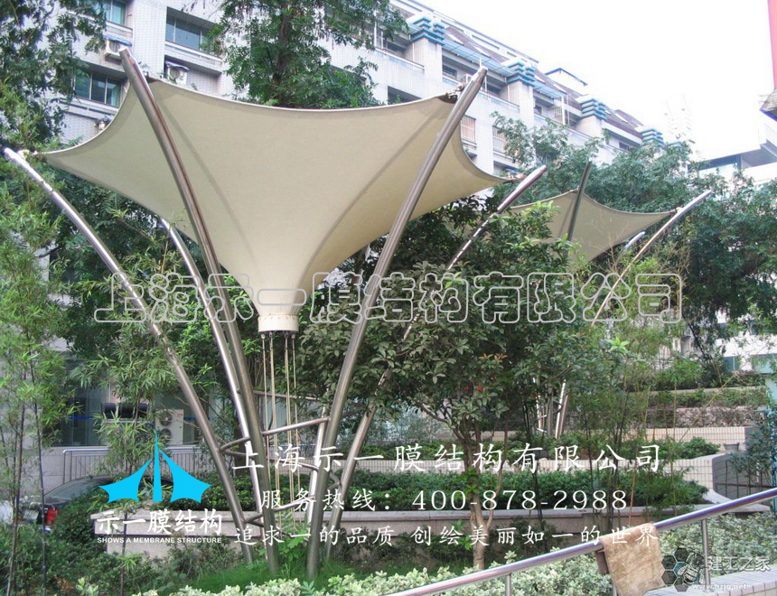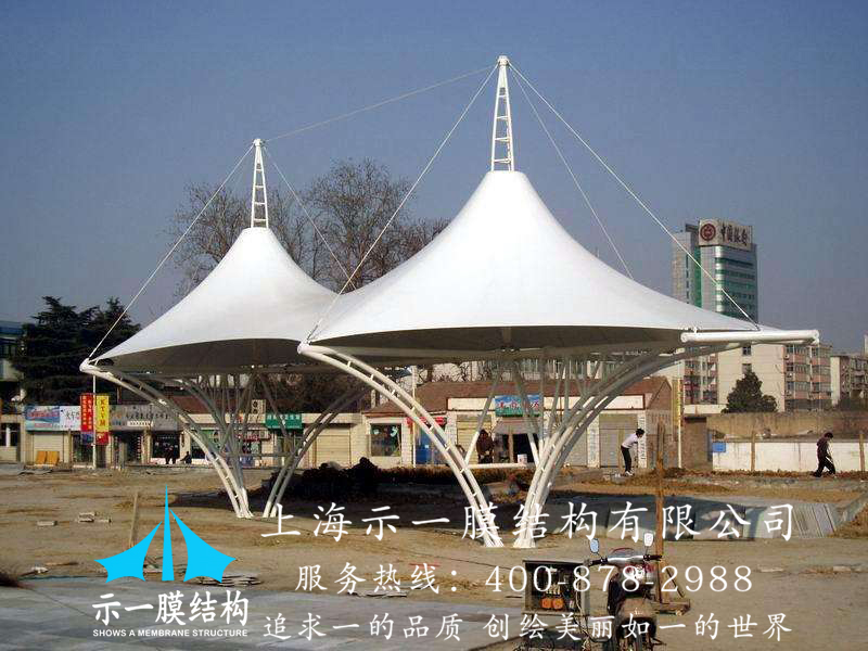 張拉膜結構是目前無論在景觀或者是膜結構建筑中,比較常見的一種形式。l張拉膜結構的基本組成單元通常有:膜材、索與支承結構(桅桿、拱或其他剛性構件)。對于張拉膜結構,任何附加的支撐和修飾都是多余的,其結構本身就是造型;換句話說,不符合結構的造型是不可能的,因為那樣的薄膜不是飄動的就是缺乏穩定性的。張拉膜結構的美就在于其“力”與“形”的完美結合。