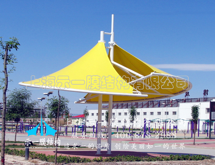 4.應盡量避免環境中出現與環境不協調的景觀膜結構。制造景觀膜結構的材料有鋼結構、膜材料、鋼構件、預制混凝土、配件等,大部分景觀膜結構的膜材質在環境中幾乎都能夠適用。不過其不同材質厚度放置在與之相適應的環境中。