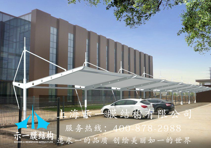 由于高強度的膜材出現,再加上張拉技術的應用,使膜結構車棚抵御風雨的能力是一般雨蓬不可比擬的。有的車棚采用永久性膜材,可使用三、四十年。特別是遇到劇烈的暴風雨天氣,膜結構建筑巍然不動,毫發不損。除了一般雨蓬不可比擬的實用、耐用、遮風擋雨的功能外,膜結構雨蓬更是一座雕塑,一件藝術品,給人美的視覺享受。其柔美,其曲線,其剛柔并濟,其豐富造型,其潔白無瑕,讓人眼前一亮,回味悠長。研究表明,長期露天停放的車輛,性能損耗速度比車棚內停放車輛快一倍。而采用膜結構雨蓬更能真正呵護您的愛車,減緩您愛車的老化速度。從經濟角度來說,投入不多卻大大延長您座騎的壽命。透光性能好(透光率20%)。在陽光下曝曬不會產生黃變、霧化、透光不佳。
