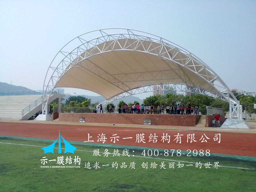 膜結構是一種新型材料,具有藝術性,經濟性,保溫性,自潔性,防火性,吸音性和透光性。膜結構運用于體育看臺能更好的體現膜結構的這一特性。體育看臺膜結構比傳統看臺相比,具有造型優美,空間跨度大,自重輕,使用年限時間長等特點。膜結構是一種全新的建筑結構形式,它集建筑學、結構力學、精細化工與材料科學、計算機技術等為一體,具有很高技術含量。其曲面可以隨著建筑師的設計需要任意變化,結合整體環境,建造出標志性的形象工程??磁_膜結構膜材料是以聚酯纖維基布或PVDF、PVF、PTFE等不同的表面涂層,配以優質的PVC組成的具有穩定的形狀,并可承受一定載荷的建筑紡織品。它的壽命因不同的表面涂層而異,一般可達成15—30年。