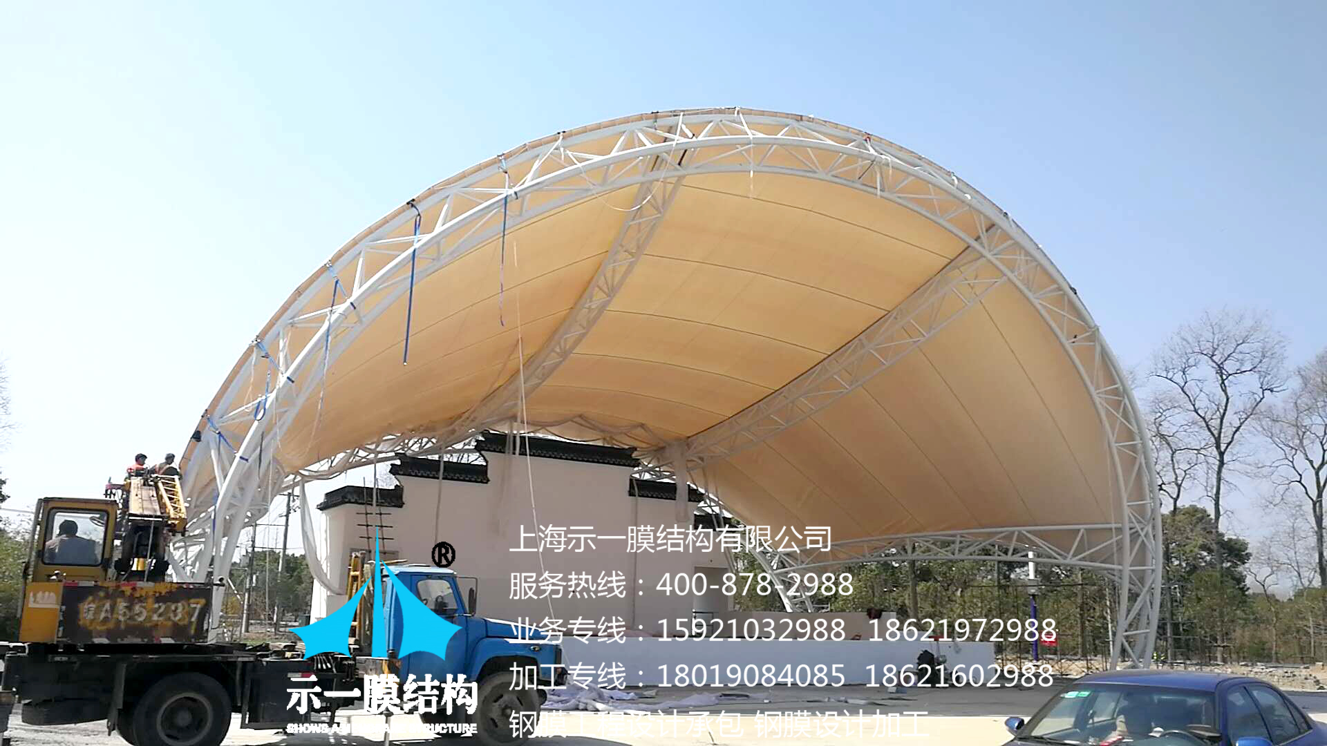 1、舞臺張拉膜結構的共同曲面外形使其具有激烈的雕塑感,膜面經過張力到達自平衡。
