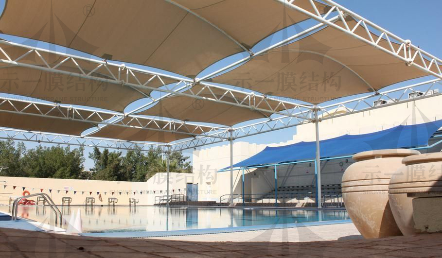 膜結構遮陽棚一改傳統遮陽設施造型沉悶的特點,給設計師以更大的發揮空間,可以賦予遮陽棚更多曲面、線條,使得整個遮陽棚看起來非常具有張力及雕塑感,游泳池本來就是一種游樂設施,加上具有藝術感造型的膜結構遮陽棚,簡直就是錦上添花,這也間接的為經營者增加口碑效益,增加營收。