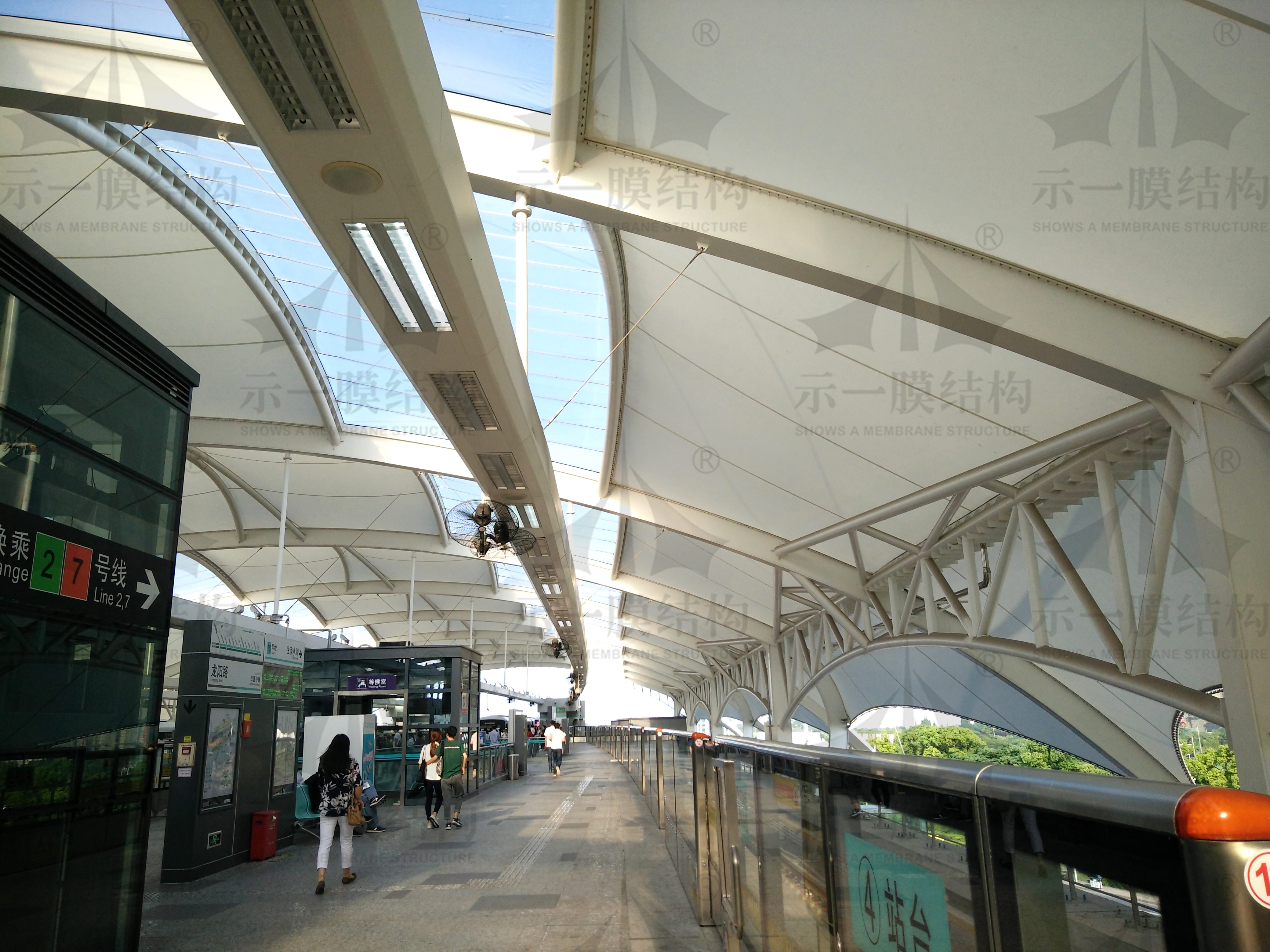 第一站我們來到的是上海龍陽路地鐵站,來看一下地鐵站中的膜結構遮陽棚。這里的膜結構遮陽棚沒有很花俏的造型卻是很貼心的設計,能很好的遮陽遮雨方便了坐地鐵的人也給換乘的人們提供了更多的便捷同時也讓我們感受到了一絲溫暖,充滿愛的旅途是滿滿的幸福。