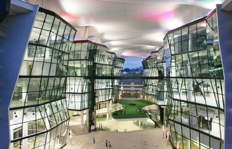 新加坡拉薩爾藝術學院是當代頂尖的設計教育及實踐類領銜高等院校。該學院作為國際競標的一個項目,建筑自身成為了藝術設計的一部分,設計師將其打造成一個大體量的“黑箱子”,使得建筑內部的一切都向外翻轉,墻體上的窗洞最大程度地將校園景觀和街景滲透到室內,室外的面板則是由石料和鋁合金打造的,建筑之間通過中庭和天橋彼此形成統一的整體。