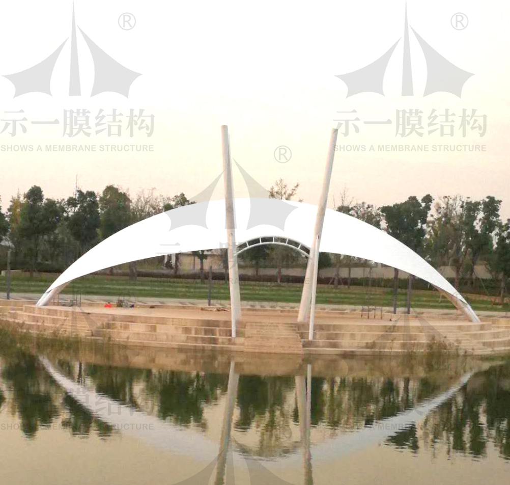 膜結構景觀結構,它以性能優良的柔軟織物為材料,由內部空氣壓力支承膜面,或利用柔性鋼索和剛性支承結構使膜面產生一定的預力,從而形成具有能覆蓋大空間的新型空間結構體系。膜結構一般可分為充氣式膜結構(也叫空氣支承膜結構)、張拉膜結構及骨架支承式膜結構三種,它們具有不同的結構特點、建筑表現形式,適應不同的環境。