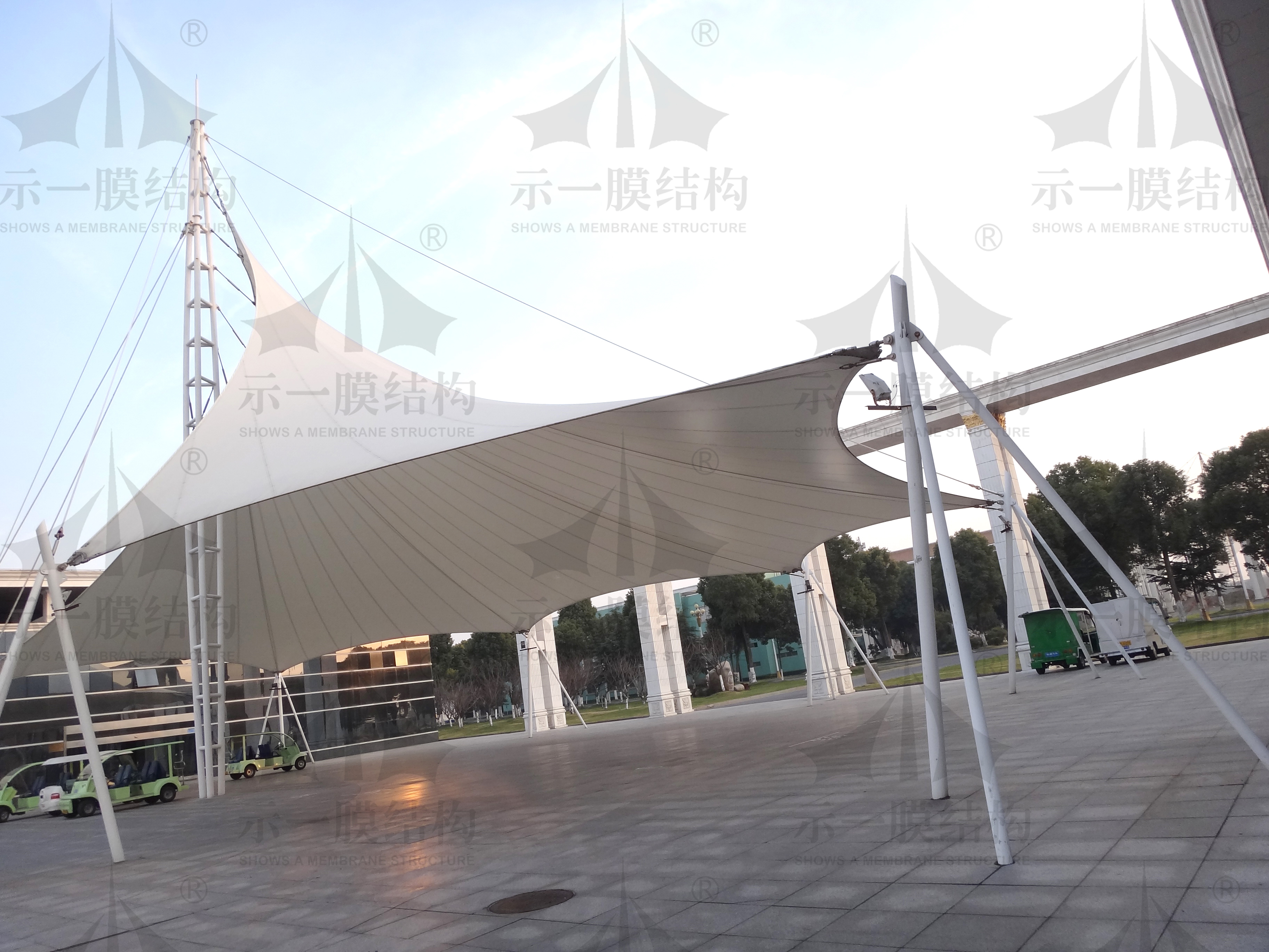 有上海示一膜結(jié)構(gòu)公司建造的膜結(jié)構(gòu)建筑也有很多,比如膜結(jié)構(gòu)停車棚、膜結(jié)構(gòu)景觀遮陽棚,膜結(jié)構(gòu)體育看臺遮陽頂棚、舞臺膜結(jié)構(gòu)、游泳池膜結(jié)構(gòu)等等,遍布全國。膜結(jié)構(gòu)的時代已經(jīng)來臨,期待示一給您帶來更多不一般的膜結(jié)構(gòu)建筑。