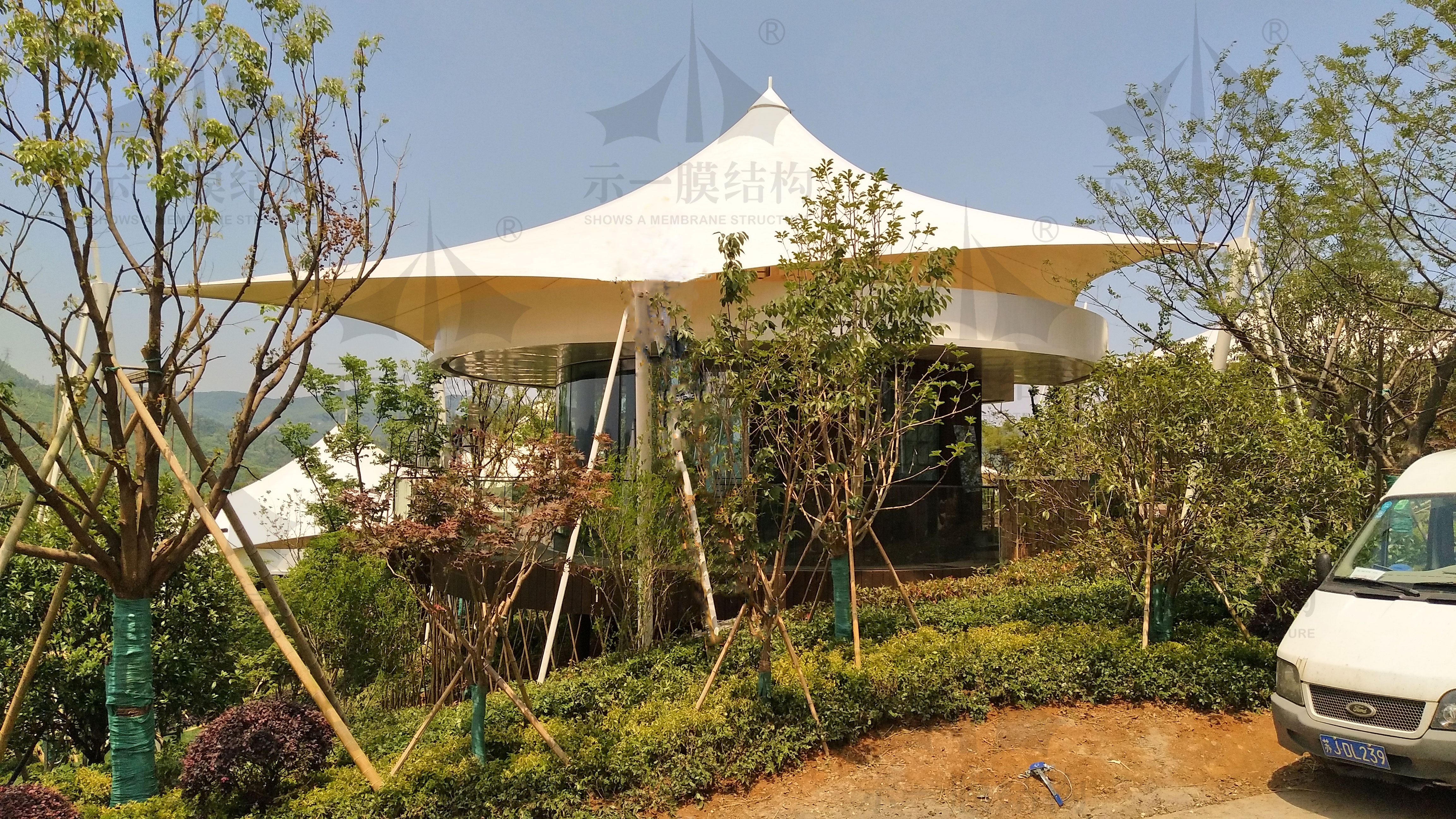 然后是膜材上的運用,采用環保高分子膜材,可抗紫外線照射,抗撕裂的性能強,阻燃性能好,使用年限比較長。都是能看的到的一些優勢。另外要說的一點是,抵御自然環境能力強。很多大自然惡劣天氣避免不了,所以期初在設計的時候我們都會考慮一些自然因素以及安全性,嚴格要求。